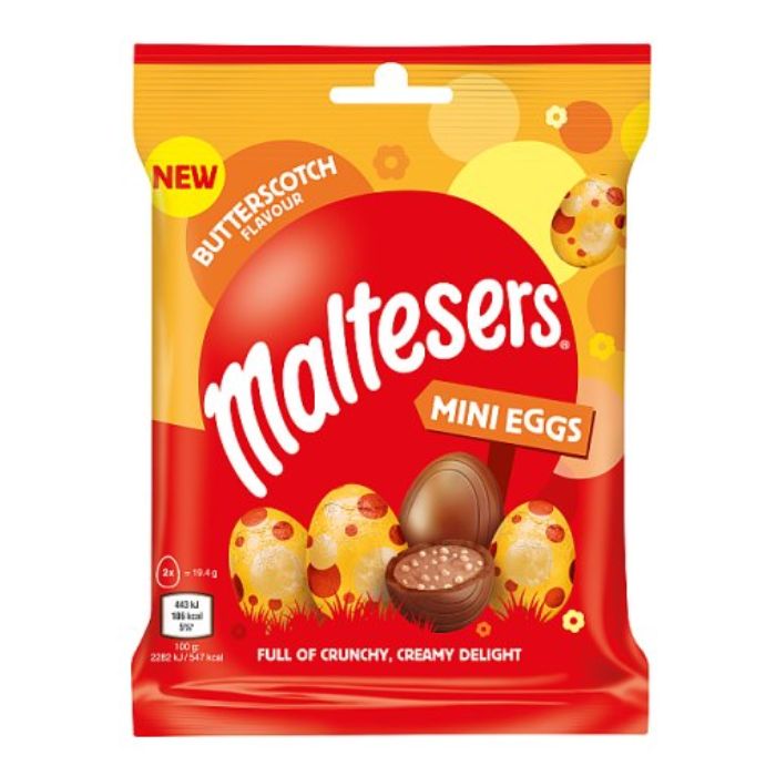 Maltesers Mini Eggs Butterscotch 77g: Η αγαπημένη τραγανή υφή συναντά τη γεύση καραμέλας βουτύρου.